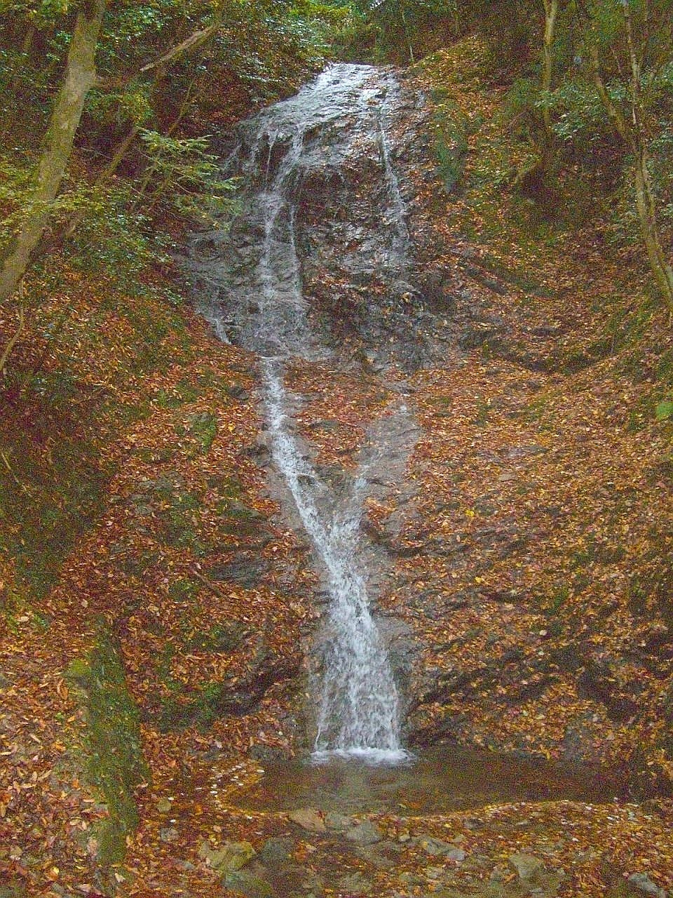 周囲の森林に囲まれ薄暗い所に隠れるように流れ落ちています。