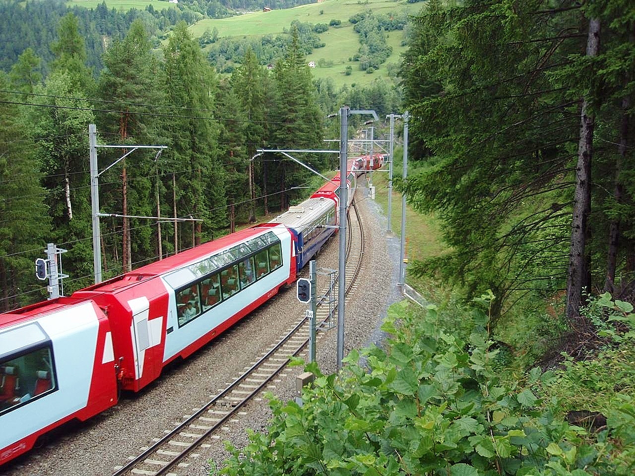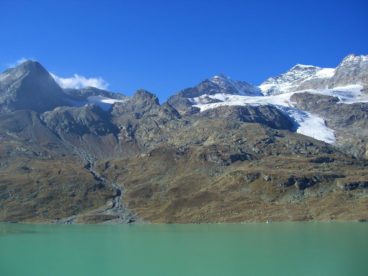 万年雪を戴くベルニナアルプス最高峰のピッツ・ベルニナ(標高約4,049m)、白く輝く氷河、静寂をたたえる氷河湖のビアンコ湖を間近に眺め、高度を上げ、ヨーロッパ最高所の鉄道駅オスピツィオ・ベルニナ駅(標高約2,253m)から下りにかかり、360度の弧を描くブルージオのループ橋で急峻な谷を下り、イタリアのティラーノへ。その鉄道技術はその後のスイスの鉄道のみならず、日本の箱根登山鉄道のモデルにもなりました。